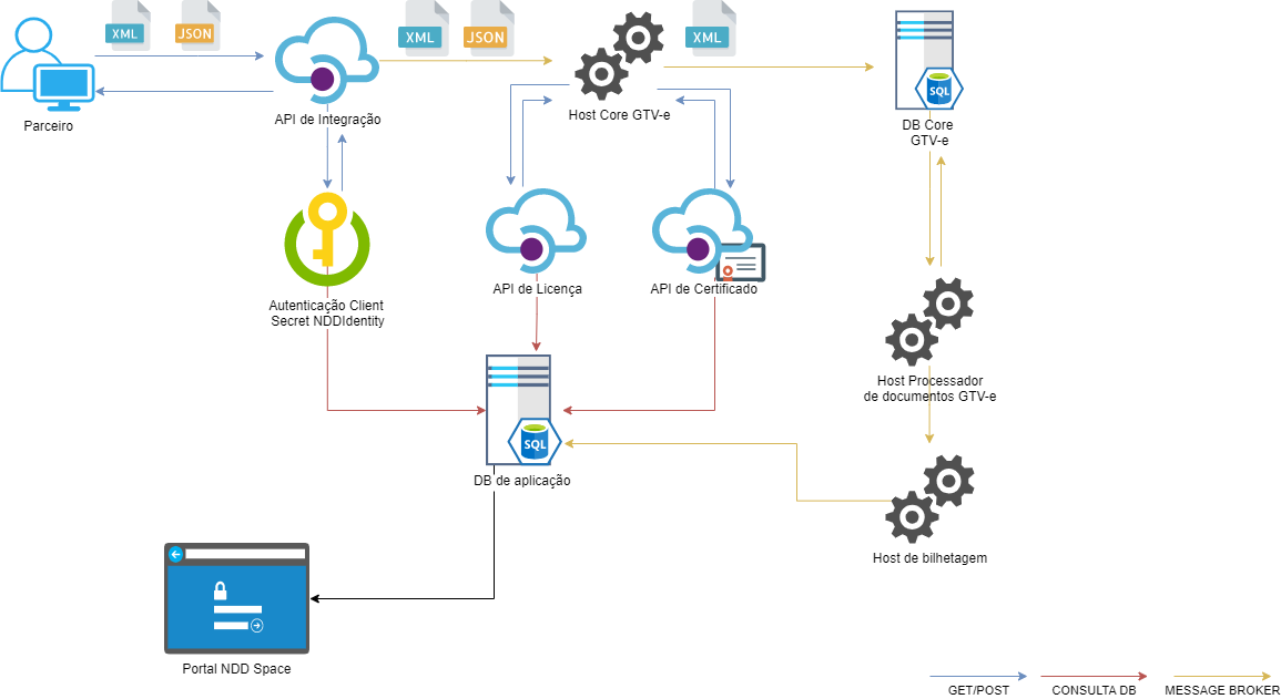 Confira a seguir o fluxo de integração entre ERP (Parceiro) e NDD Space, para GTV-e: